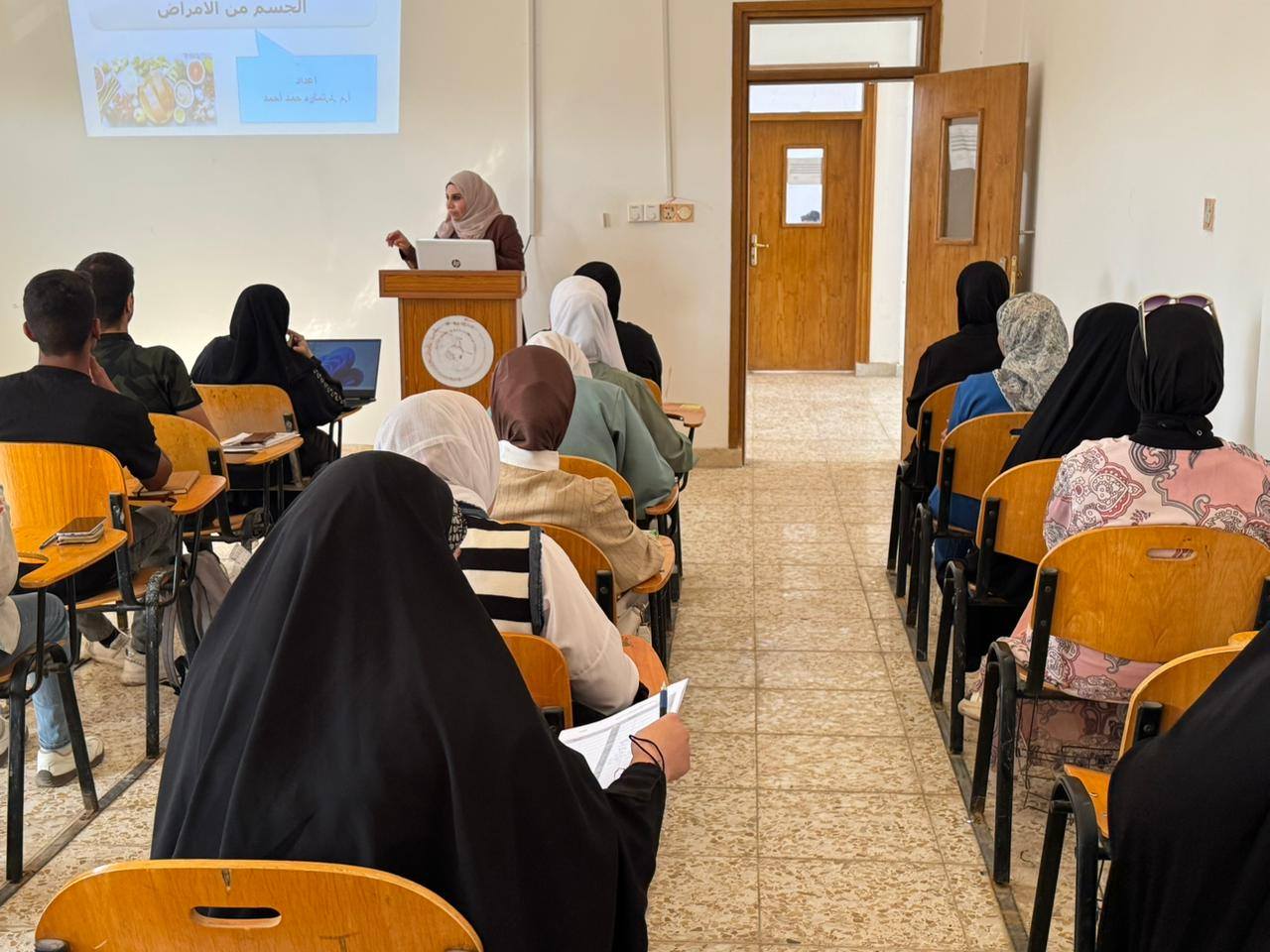 وفي ختام هذه الندوة تم اجراء فعالية واختبار قياس مؤشر كتلة الجسم BMI على منتسبي الكلية والطلبة لمعرفة الاوزان المثالية والزائدة والسمنة.