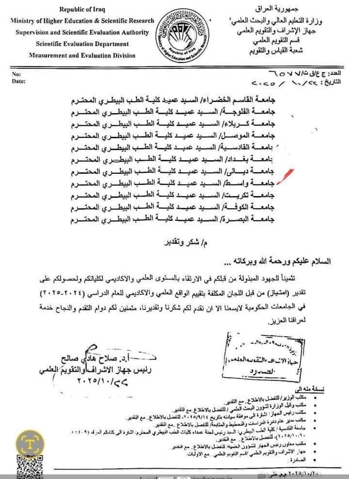 تثمينًا للجهود المتميزة المبذولة في الارتقاء بالمستوى العلمي والأكاديمي للكلية، وجه جهاز الإشراف والتقويم العلمي في وزارة التعليم العالي والبحث العلمي كتاب شكر وتقدير إلى الأستاذ الدكتور #ستار راشد سهيل، عميد كلية الطب البيطري –جامعة واسط، وذلك لحصول الكلية على تقدير (امتياز)في تقييم الواقع العلمي والأكاديمي للعام الدراسي 2024–2025 ضمن كليات الطب البيطري في الجامعات الحكومية العراقية.